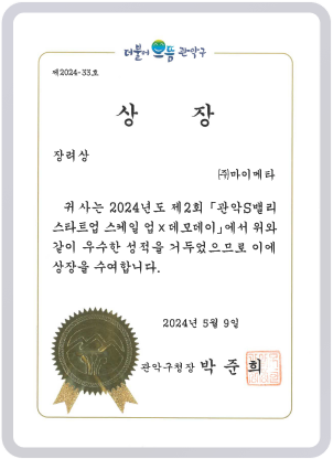 • 2024.5 Encouragement Award at the Gwanak S-Valley Startup Scale-up x Demo Day, Gwanak-gu